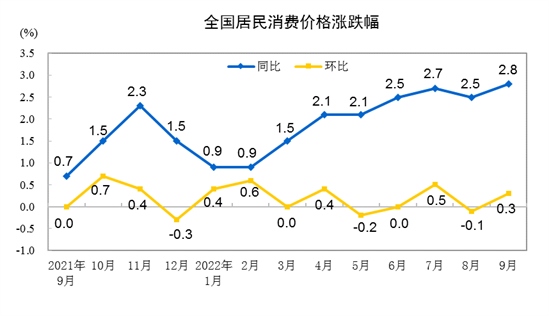 2022年9月份,全國居民消費價格同比上漲2.8%。其中,城市上漲2.7%,農(nóng)村上漲3.1%;食品價格上漲8.8%,非食品價格上漲1.5%;消費品價格上漲4.3%,服務(wù)價格上漲0.5%。1--—9月平均,全國居民消費價格比上年同期上漲2.0%。