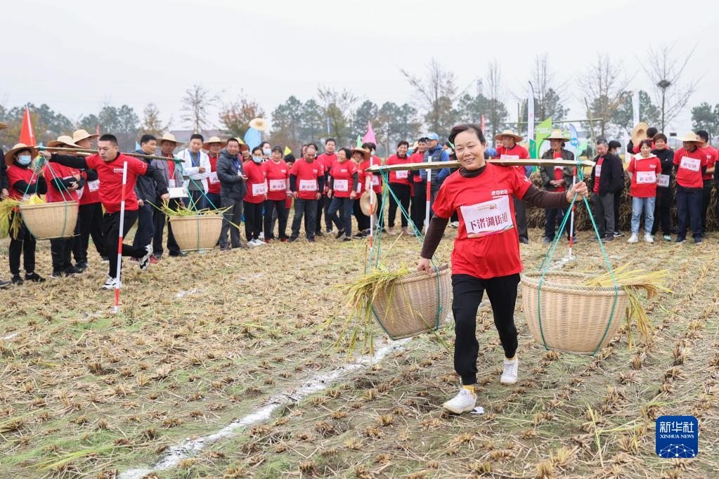 11月15日,在德清縣舉辦的美好家園運(yùn)動(dòng)會(huì)暨新安鎮(zhèn)稻田爭(zhēng)霸賽上,村民參加挑稻谷接力賽。新華社發(fā)(姚海翔 攝)