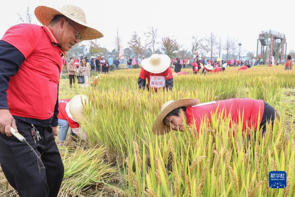 11月15日,在德清縣舉辦的美好家園運(yùn)動(dòng)會(huì)暨新安鎮(zhèn)稻田爭(zhēng)霸賽上,村民參加割稻比賽。新華社發(fā)(姚海翔 攝)