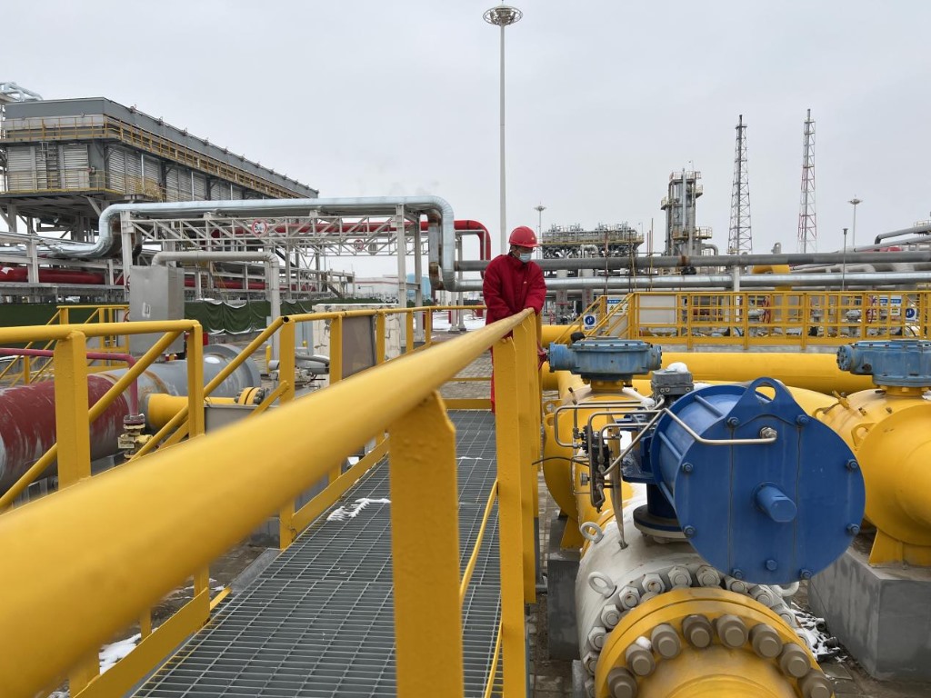 呼圖壁儲(chǔ)氣庫(kù)采氣現(xiàn)場(chǎng),工作人員正在檢查設(shè)備。(新華社發(fā))