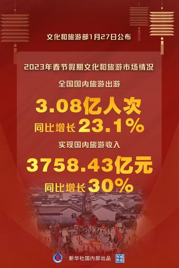 文化和旅游部27日公布2023年春節(jié)假期文化和旅游市場情況。經(jīng)文化和旅游部數(shù)據(jù)中心測算,今年春節(jié)假期全國國內(nèi)旅游出游3.08億人次,同比增長23.1%。實現(xiàn)國內(nèi)旅游收入3758.43億元,同比增長30%。全國文化和旅游市場總體安全平穩(wěn)有序。