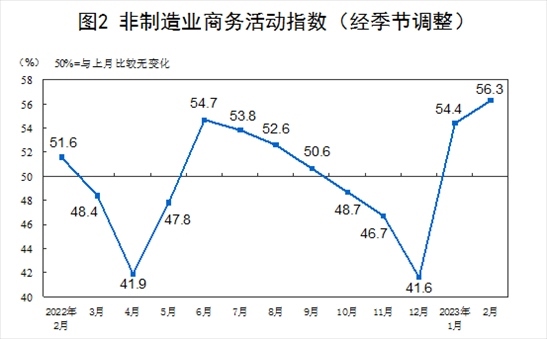 2月份,非制造業(yè)商務(wù)活動指數(shù)為56.3%,比上月上升1.9個(gè)百分點(diǎn),連續(xù)兩個(gè)月位于景氣區(qū)間,非制造業(yè)恢復(fù)發(fā)展態(tài)勢向好。
