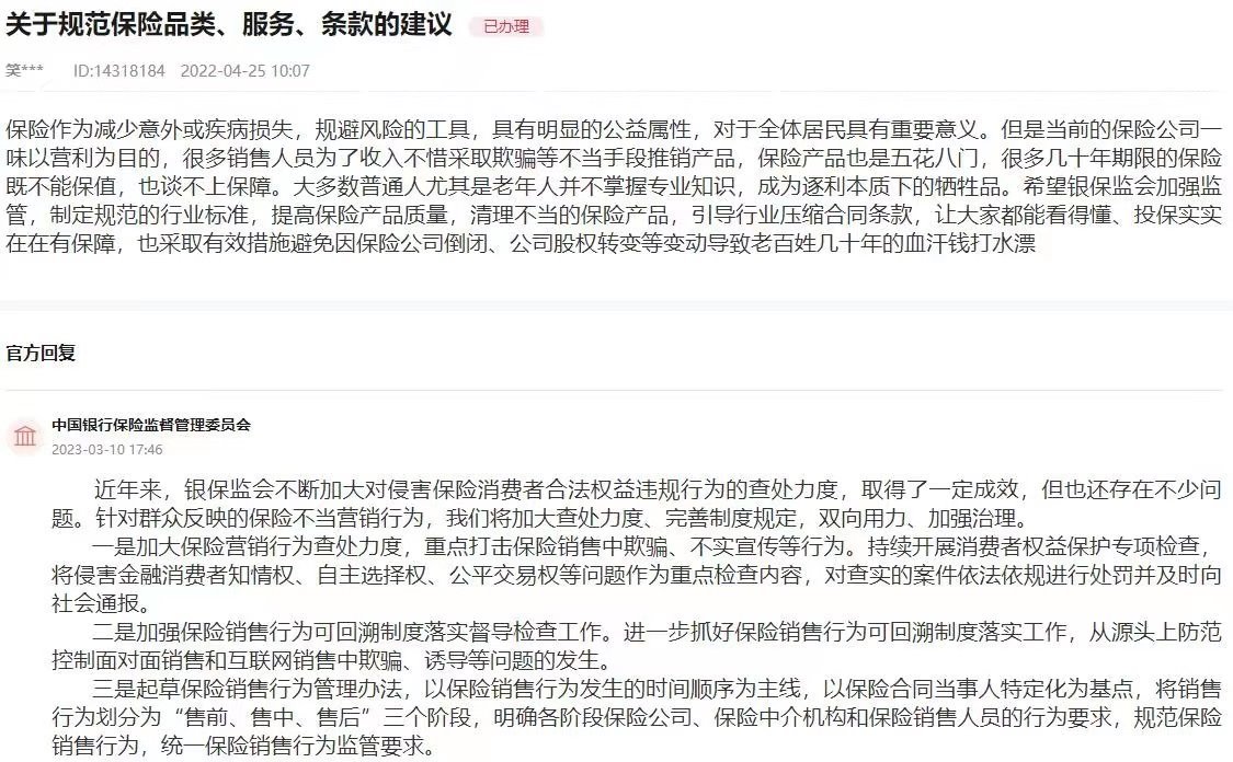 “近年來,銀保監(jiān)會(huì)不斷加大對侵害保險(xiǎn)消費(fèi)者合法權(quán)益違規(guī)行為的查處力度,取得了一定成效,但也還存在不少問題?!便y保監(jiān)會(huì)在回復(fù)中表示,針對群眾反映的保險(xiǎn)不當(dāng)營銷行為,將加大查處力度、完善制度規(guī)定,雙向用力、加強(qiáng)治理。