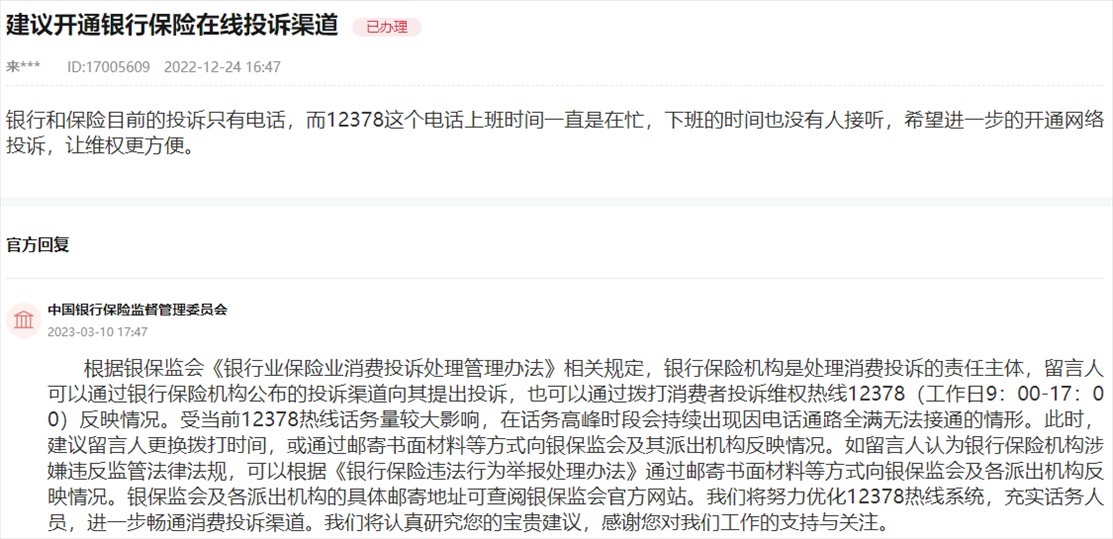 針對網(wǎng)友提出的“建議開通銀行保險(xiǎn)在線投訴渠道”,銀保監(jiān)會(huì)在回復(fù)中表示,將努力優(yōu)化消費(fèi)者投訴維權(quán)熱線12378系統(tǒng),充實(shí)話務(wù)人員,進(jìn)一步暢通消費(fèi)投訴渠道。