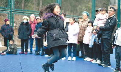 貴州省黔西南布依族苗族自治州安龍縣易地扶貧搬遷安置點春潭街道蘑菇小鎮(zhèn)新市民居住區(qū)舉辦趣味體育運動會,轄區(qū)居民進行了跳繩、拔河比賽等趣味項目,體驗運動的快樂。圖為小朋友正在參加跳繩比賽。劉朝富攝(人民視覺)