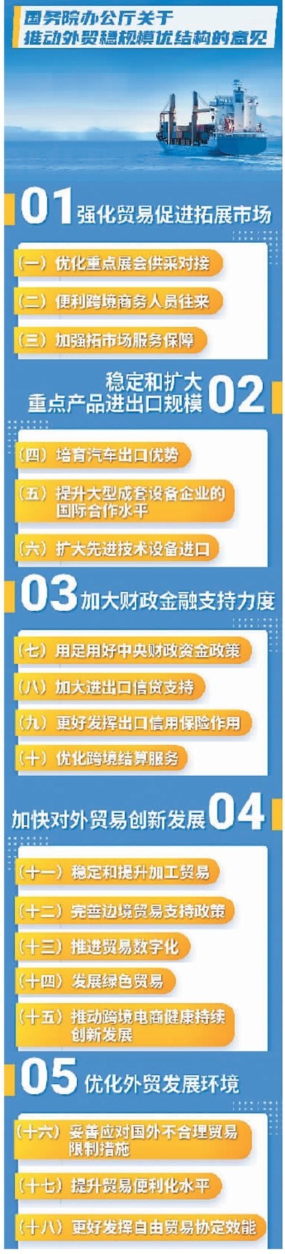 為推動(dòng)外貿(mào)穩(wěn)規(guī)模優(yōu)結(jié)構(gòu),在前期已出臺(tái)多輪政策舉措的基礎(chǔ)上,國務(wù)院辦公廳4月25日對(duì)外發(fā)布《關(guān)于推動(dòng)外貿(mào)穩(wěn)規(guī)模優(yōu)結(jié)構(gòu)的意見》(以下簡稱《意見》),推出新一輪措施。專家認(rèn)為,此次提出的18條具體措施既涉及重點(diǎn)產(chǎn)品,也關(guān)乎市場拓展和貿(mào)易創(chuàng)新,具有很強(qiáng)的針對(duì)性和操作性,有助于穩(wěn)住外貿(mào)規(guī)模,并在此基礎(chǔ)上進(jìn)一步優(yōu)化外貿(mào)結(jié)構(gòu),推動(dòng)實(shí)現(xiàn)全年進(jìn)出口促穩(wěn)提質(zhì)目標(biāo)任務(wù)。
