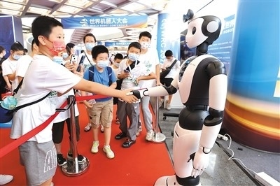 在北京亦創(chuàng)國際會展中心舉行的2022世界機(jī)器人博覽會上,小觀眾在與智能服務(wù)機(jī)器人握手。陳曉根攝(人民視覺)