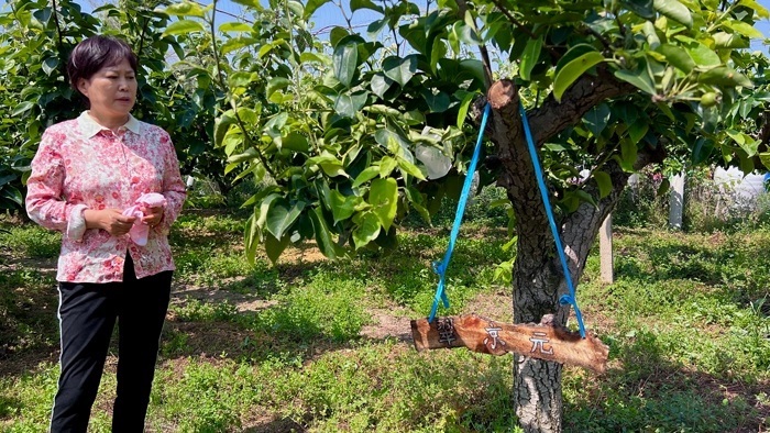 附近村民在梨園里實現(xiàn)就業(yè)。初夏時節(jié),村民給剛長出的小梨“穿衣裳”。