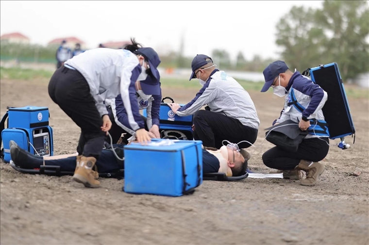 他們首先將模擬航天員抬到鏟式擔(dān)架上,迅速作出病情判斷后,立即護(hù)送進(jìn)入救護(hù)直升機(jī)??紫殄|發(fā)出指令,趙琳輸送氧氣,朱明開(kāi)始心電監(jiān)測(cè),高曉佩建立靜脈通道……。經(jīng)初步驗(yàn)傷,按照原定救治程序展開(kāi)急救……演習(xí)于第二天上午10時(shí)結(jié)束,返回駐地,大家立刻顧不上休整,又迅速對(duì)演練進(jìn)行復(fù)盤(pán)。