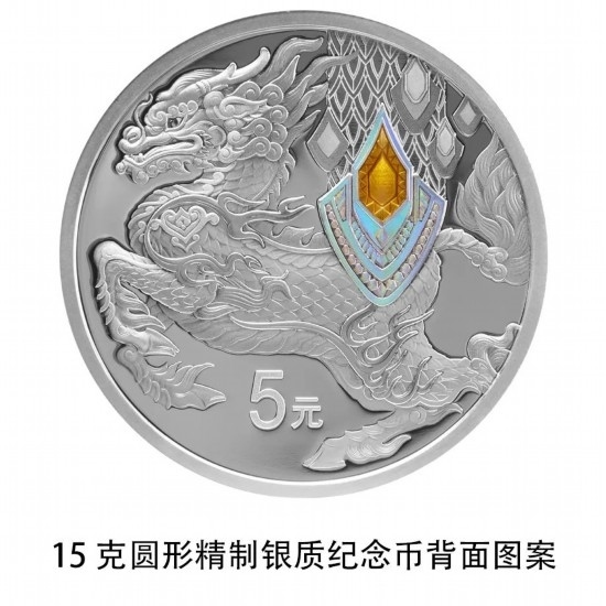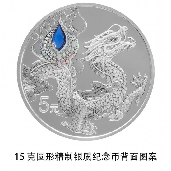 15克圓形銀質(zhì)紀(jì)念幣背面圖案為龍造型,并刊面額。