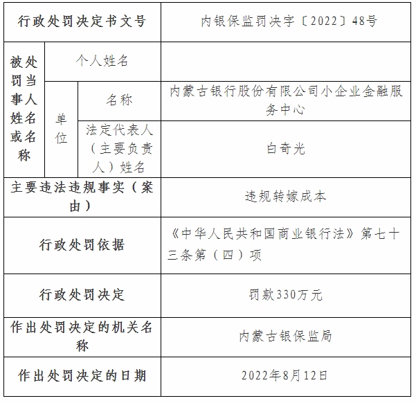 其中內(nèi)銀保監(jiān)罰決字〔2022〕44號、45號、46號行政處罰信息公開表顯示,內(nèi)蒙古銀行因關(guān)聯(lián)方授信集中度超比例、理財投資不審慎、違規(guī)發(fā)行保本理財,分別被罰款50萬元、30萬元、50萬元;內(nèi)銀保監(jiān)罰決字〔2022〕47號行政處罰信息公開表顯示,內(nèi)蒙古銀行呼和浩特分行違規(guī)掩蓋資產(chǎn)質(zhì)量,被罰款50萬元;內(nèi)銀保監(jiān)罰決字〔2022〕48號行政處罰信息公開表顯示,內(nèi)蒙古銀行小企業(yè)金融服務(wù)中心因違規(guī)轉(zhuǎn)嫁成本,被罰款330萬元。