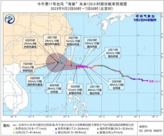9月2日08時至3日08時,受“蘇拉”影響,南海西北部、北部灣東部、瓊州海峽及廣東沿海、廣西南部沿海、珠江口以及香港和澳門等地將有7-9級、陣風10-11級的大風,“蘇拉”中心經(jīng)過的附近海面或地區(qū)風力有12-13級、陣風14-15級;受“海葵”影響,臺灣海峽、浙江南部沿海、福建沿海、廣東東部沿海、臺灣島沿海將有6-7級,陣風8級大風,臺灣以東洋面部分海域風力可達8-10級,陣風11-12級,“??敝行慕?jīng)過的附近海面風力可達12-13級,陣風14級。