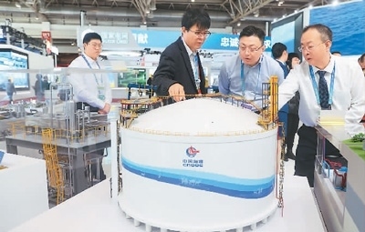 11月29日,在北京舉行的首屆中國國際供應(yīng)鏈促進博覽會上,參觀者了解中海石油獨創(chuàng)的擁有自主知識產(chǎn)權(quán)的全容式液化天然氣(LNG)儲罐。陳曉根攝(人民視覺)
