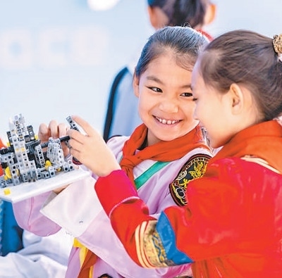 內(nèi)蒙古呼和浩特市,小學生在校學習組裝機器人。丁根厚攝(影像中國)