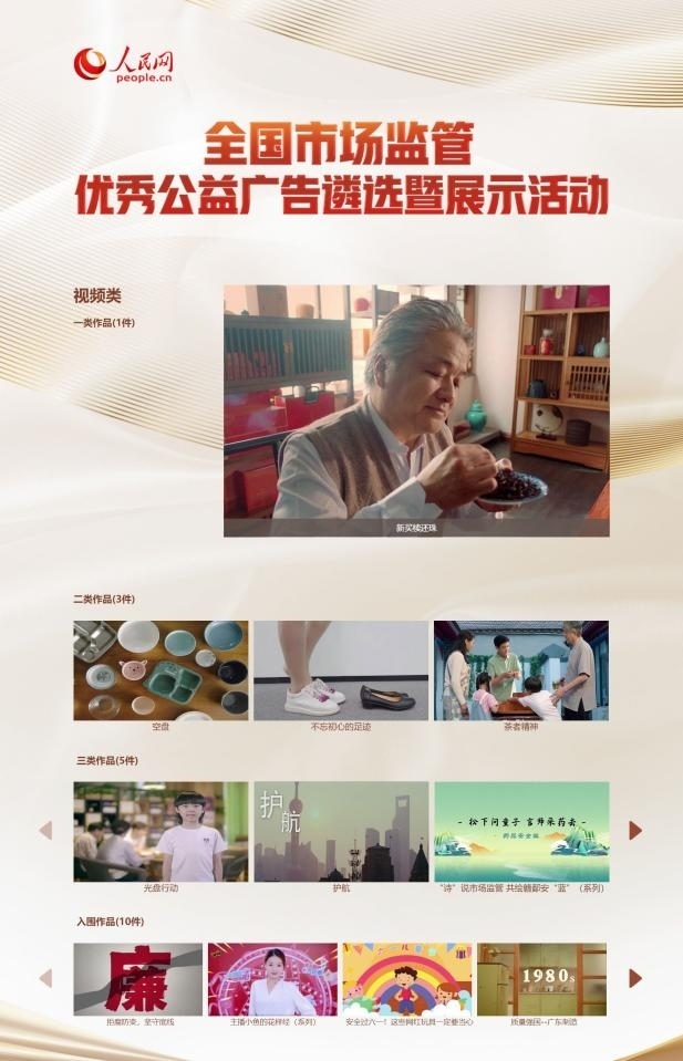 人民網(wǎng)北京12月17日電 (記者許維娜)公益廣告是弘揚社會主義核心價值觀的重要載體,也是促進市場監(jiān)管文化建設的重要力量。15日下午,全國市場監(jiān)管優(yōu)秀公益廣告遴選暨展示活動評審結果在北京揭曉。此次活動共評選出視頻類和平面類入選作品各19件,其中一類作品各有1件,二類作品各有3件,三類作品各有5件,入圍作品各有10件。