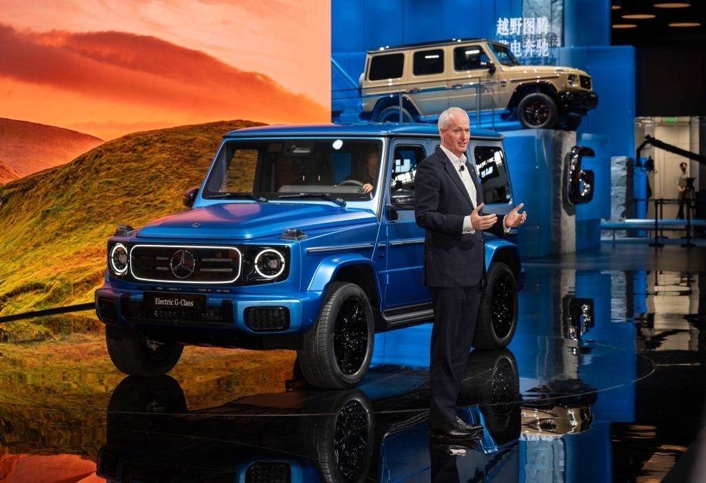 4月25日,在北京中國國際展覽中心順義館舉行的2024北京車展上,梅賽德斯—奔馳集團(tuán)股份公司董事會成員唐仕凱介紹梅賽德斯—奔馳純電G級越野車。新華社記者 才揚(yáng) 攝