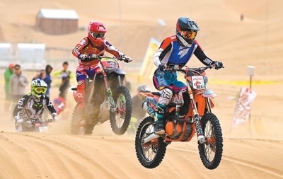 戶外運(yùn)動(dòng)愛(ài)好者在內(nèi)蒙古鄂爾多斯市杭錦旗參加摩托車沙漠越野場(chǎng)地賽。王 正攝(人民視覺(jué))