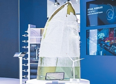 西門子能源展出全球首款可回收風機葉片。葉片使用周期結束后,其部件材料可通過工業(yè)化方式,進行樹脂和纖維材料的安全環(huán)保分離,回收的纖維材料仍保持良好性能。本報記者 廖睿靈攝