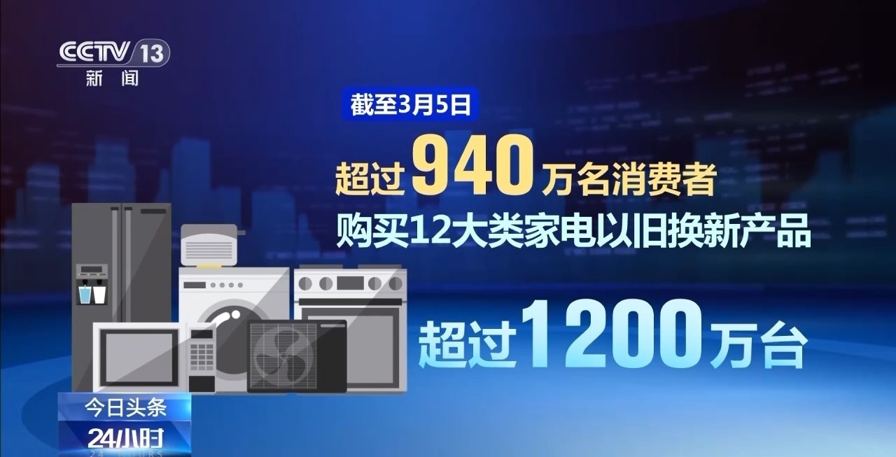商務(wù)部數(shù)據(jù)顯示,截至3月5日,超過940萬名消費者購買12大類家電以舊換新產(chǎn)品超過1200萬臺,已有超過3400萬名消費者申請了超過4200萬件手機等數(shù)碼產(chǎn)品購新補貼。