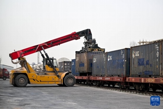 4月3日,在呼和浩特市新暢鐵路專用線,正面吊進(jìn)行集裝箱裝運(yùn)作業(yè)。