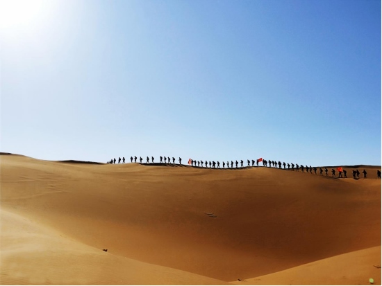 4月8日,內蒙古鄂爾多斯杭錦旗境內的庫布其沙漠,一隊游客正在沙漠中穿沙。