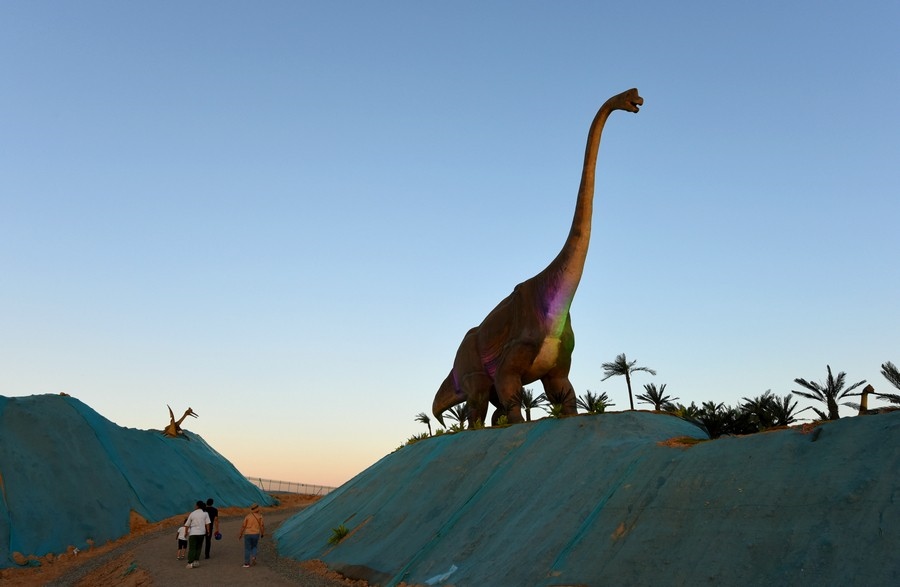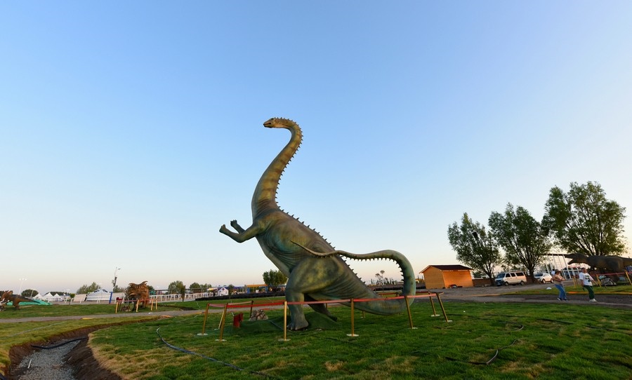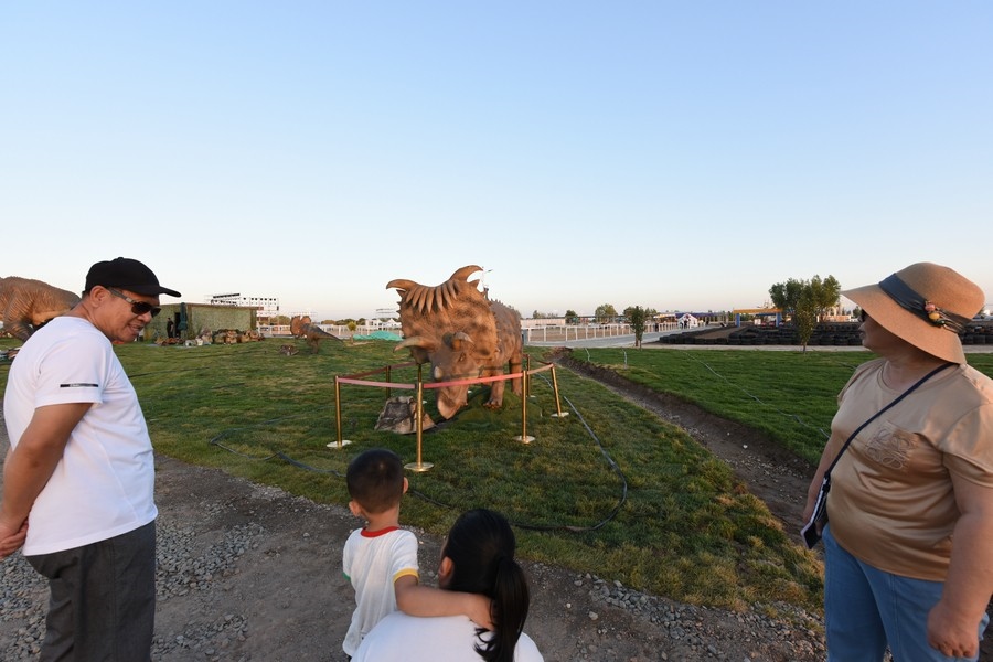 游客從高25米的亞洲最大的三條恐龍之一腳下經(jīng)過(guò)    記者 張楊攝影