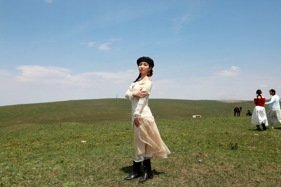 演員演出間隙在草原上拍照打卡  記者 張楊攝影