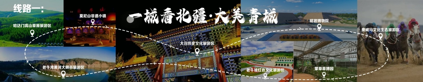 行程由呼和浩特出發(fā),至哈達(dá)門高山草原旅游區(qū),至莫尼山非遺小鎮(zhèn),至大召歷史文化旅游區(qū),再至昭君博物院,再至奧威馬文化生態(tài)旅游區(qū),再至蒙草草博園,再至老牛坡紅色文化旅游區(qū),終點(diǎn)為老牛灣黃河大峽谷旅游區(qū)。