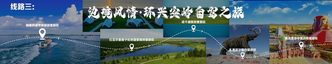 線路行程由烏蘭浩特出發(fā),至翰嘎利湖休閑旅游度假區(qū)出發(fā),再至紅花爾基樟子松林國(guó)家森林旅游區(qū),再至諾干湖旅游度假區(qū),再至扎賚諾爾猛犸旅游區(qū),終點(diǎn)為滿洲里市中俄邊境旅游區(qū)。