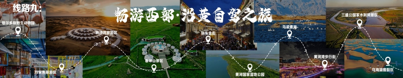 線路行程由鄂爾多斯出發(fā),至鄂爾多斯野生動(dòng)物園,至萬(wàn)家惠旅游區(qū),至響沙灣旅游區(qū)。到達(dá)包頭,至春坤山景區(qū),再至包頭金街,至黃河國(guó)家濕地公園。到達(dá)巴彥淖爾,至烏梁素海,再至黃河灣步行街,再至三盛公國(guó)家水利風(fēng)景區(qū),終點(diǎn)為烏海湖度假區(qū)。