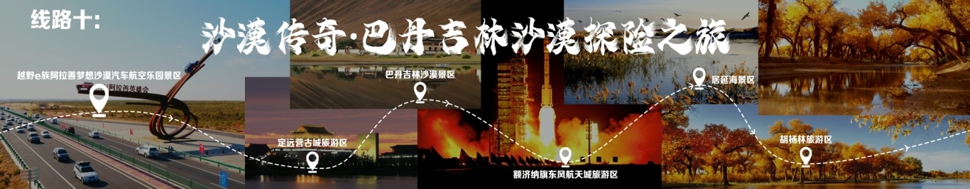 線路行程由阿拉善出發(fā),至參觀越野e族阿拉善夢(mèng)想沙漠汽車航空樂(lè)園景區(qū),至定遠(yuǎn)營(yíng)古城旅游區(qū),至巴丹吉林沙漠景區(qū),再至額濟(jì)納旗東風(fēng)航天城旅游區(qū),再至居延海景區(qū),終點(diǎn)為胡楊林旅游區(qū)。