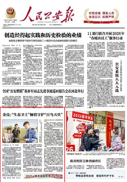 2026年1月25日《人民公安報(bào)》頭版刊發(fā)了《金亮:“生態(tài)衛(wèi)士”傾情守護(hù)“百鳥(niǎo)天堂”》的文章,報(bào)道了內(nèi)蒙古扎賚特旗公安局圖牧吉國(guó)家級(jí)自然保護(hù)區(qū)森林公安派出所所長(zhǎng)金亮的故事。作為一名當(dāng)?shù)氐摹吧鷳B(tài)衛(wèi)士”,金亮與保護(hù)區(qū)相伴的24年,參與辦理治安案件2000余起、刑事案件400余起,查處違法犯罪嫌疑人2600余名。金亮用實(shí)際行動(dòng)踐行著“守護(hù)好祖國(guó)北疆綠水青山”的偉大使命。