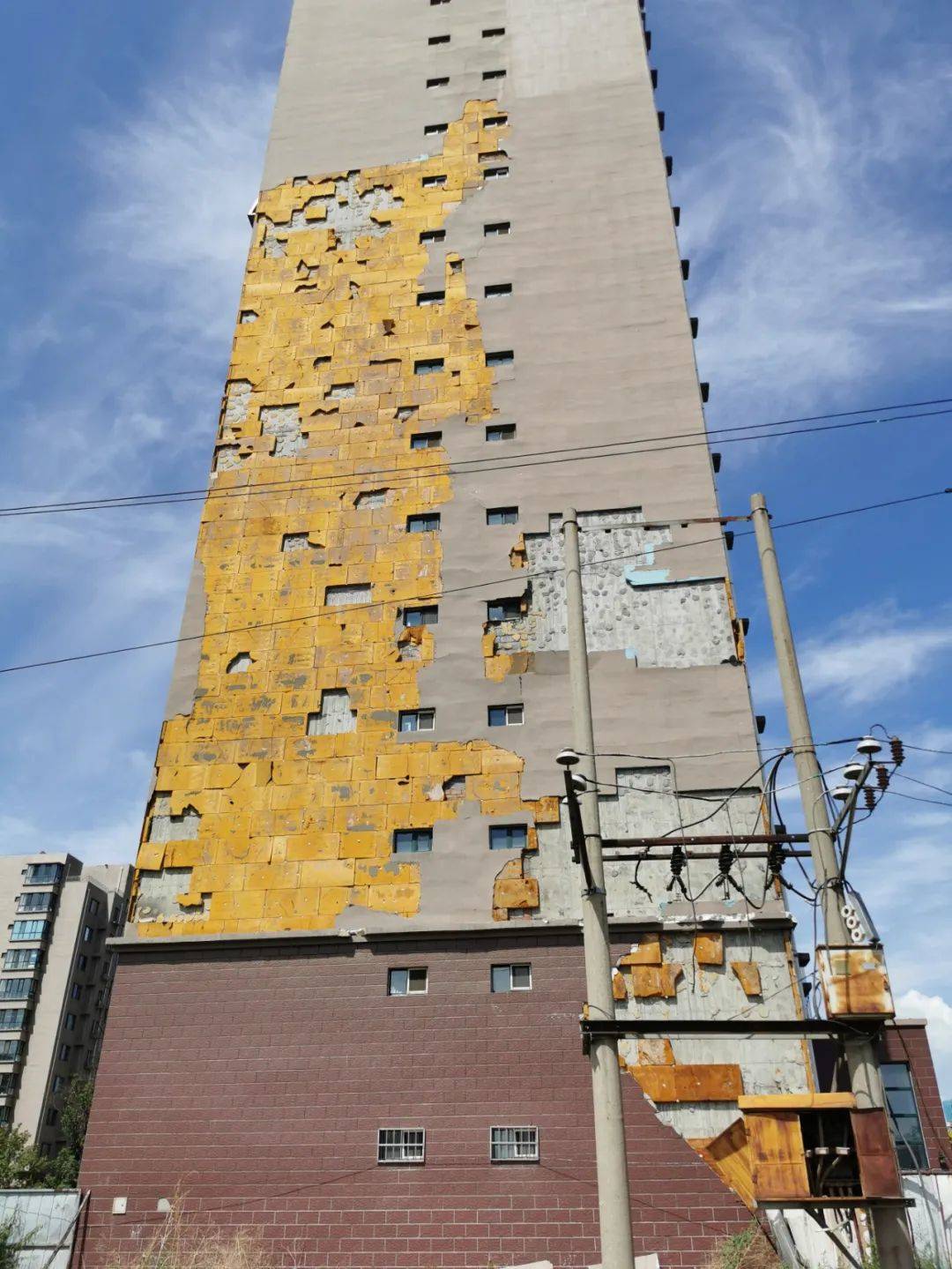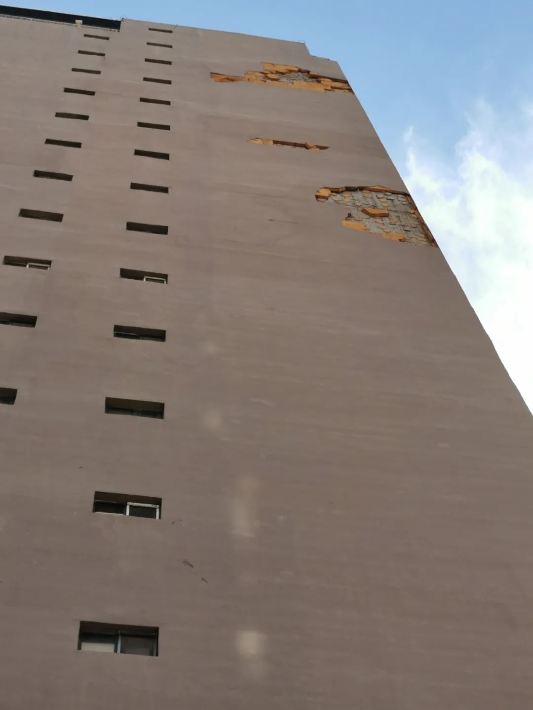 7月1日10時許,記者來到聞都雅苑4號樓下,抬頭望去,該棟樓西側(cè)墻壁有三處地方出現(xiàn)破損,大片的墻皮和里面的保溫層均已脫落。記者注意到,聞都雅苑共有4棟高層,該小區(qū)只有東西和南北兩條主干道以及西側(cè)一條小走廊,而4號樓正好位于南北主干道一側(cè)。據(jù)小區(qū)居民郝先生介紹,不斷掉落的保溫層已經(jīng)威脅到了居民的人身安全。今年5月6日,呼和浩特市出現(xiàn)大風天氣,在風力的作用下,4號樓東西兩側(cè)的外墻保溫層出現(xiàn)大面積脫落,一位恰巧路過4號樓西側(cè)的女性業(yè)主不幸被掉落的材料砸中,導致腿部受傷,此事也給小區(qū)居民帶來了恐慌。