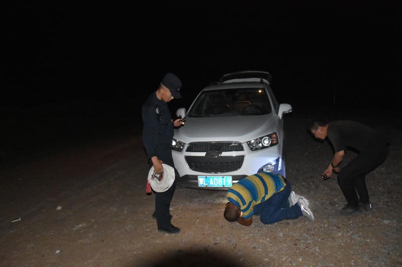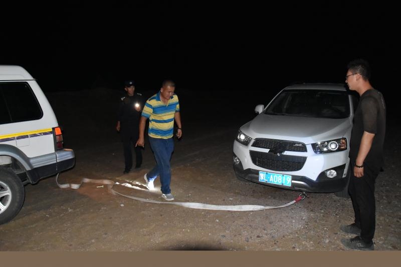 正當(dāng)二人漸漸失去希望的時(shí)候,當(dāng)晚10點(diǎn)10分,遠(yuǎn)處一道燈光閃過,原來,阿拉善邊境管理支隊(duì)溫圖高勒邊境派出所民警下鄉(xiāng)走訪正好路過。得知二人情況后,民警立即展開救援,一路迅速找出隨身攜帶的干糧、礦泉水為二人補(bǔ)充體力,一路找出牽引繩對被困車輛開展救援,經(jīng)過6個(gè)小時(shí)的拖拽,終于在凌晨4點(diǎn)將兩名群眾安全帶到了派出所。