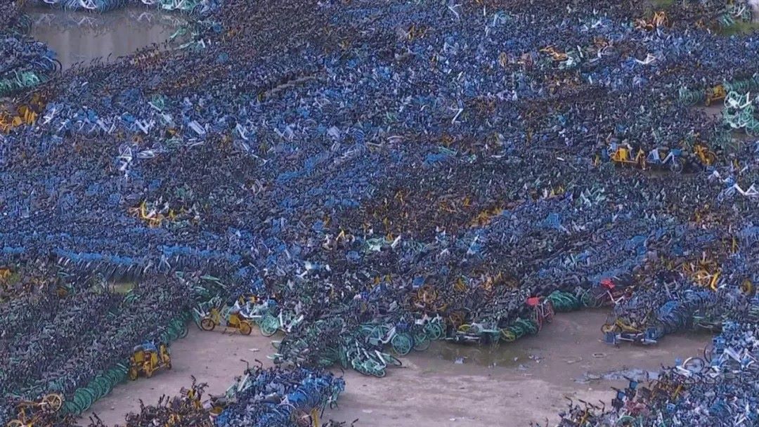 將近四萬輛的共享單車堆放在這處空地上,烏泱泱的一片。