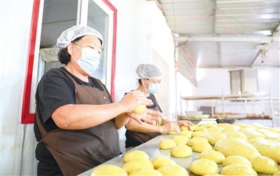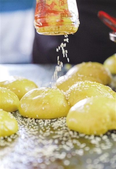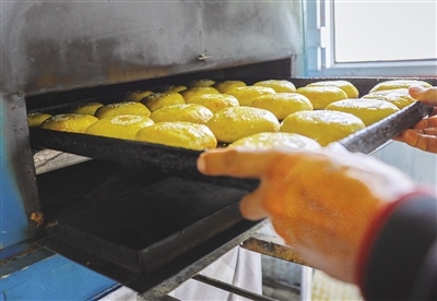 “我們堅(jiān)持手工制作,就是想留住這個味道!”常三文是隆盛莊月餅制作技藝非遺傳承人,他帶記者來到了打月餅的作坊。一個約60平方米的房間里有兩個大鐵鍋,一個鐵鍋里熬著糖水,另一個鐵鍋用來和面。一名男工將面粉、熟胡麻油、糖水等按比例倒入鐵鍋,然后用鐵鏟攪拌起來。鐵鍋旁邊是一個做月餅的大案板,4個女工稱重、分劑、做胚、擺放,各自忙活著。常三文的兒子常曉峰負(fù)責(zé)將擺放好的月餅放進(jìn)燒爐火的烤爐,計(jì)時、下簽子、刷油……直至月餅烤制完成出爐。