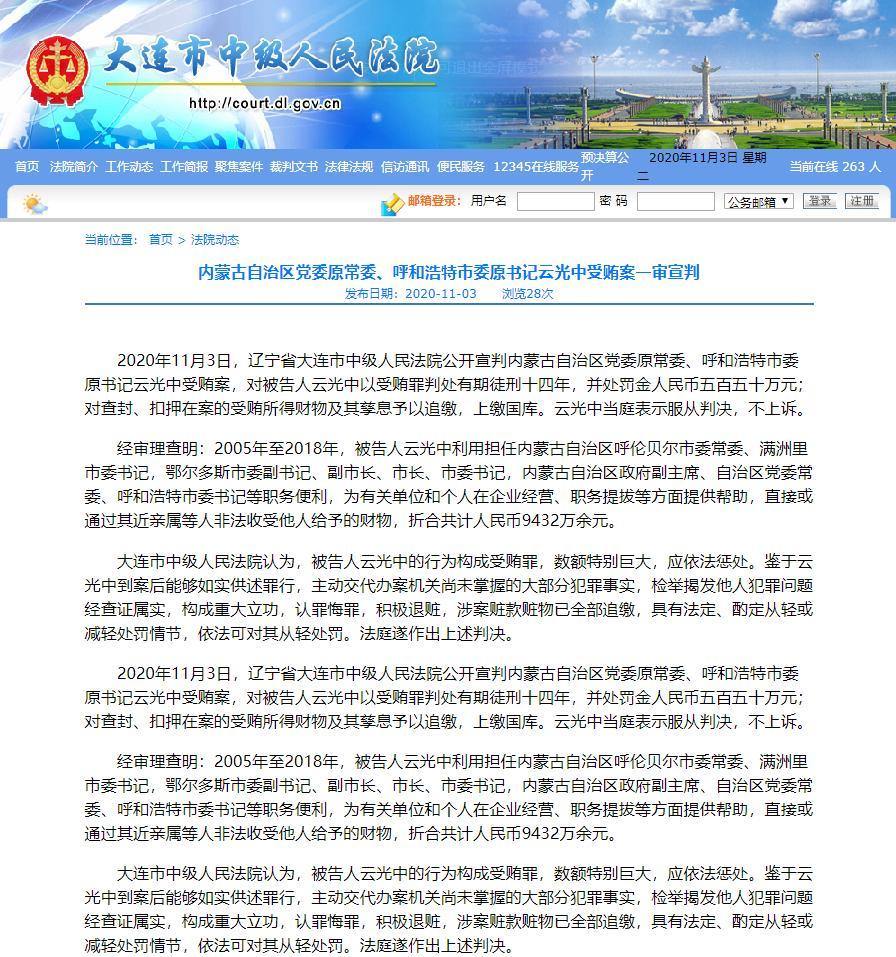 2020年11月3日,遼寧省大連市中級(jí)人民法院公開宣判內(nèi)蒙古自治區(qū)黨委原常委、呼和浩特市委原書記云光中受賄案,對(duì)被告人云光中以受賄罪判處有期徒刑十四年,并處罰金人民幣五百五十萬元;對(duì)查封、扣押在案的受賄所得財(cái)物及其孳息予以追繳,上繳國(guó)庫(kù)。云光中當(dāng)庭表示服從判決,不上訴。
