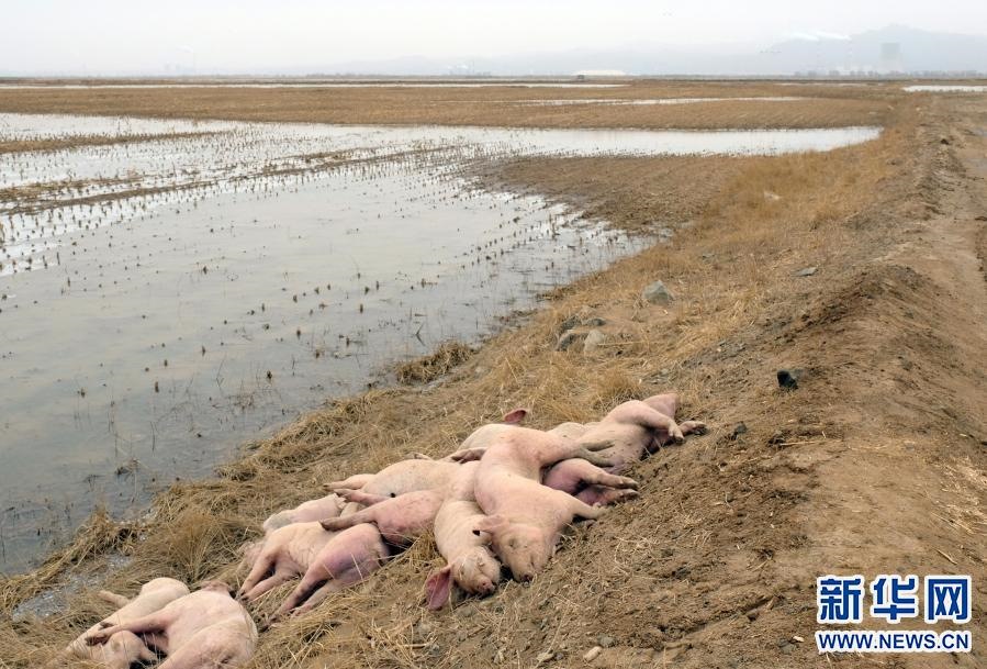 這是3月16日在達拉特旗黃河國堤內(nèi)拍攝的死豬。新華社記者 賈立君 攝