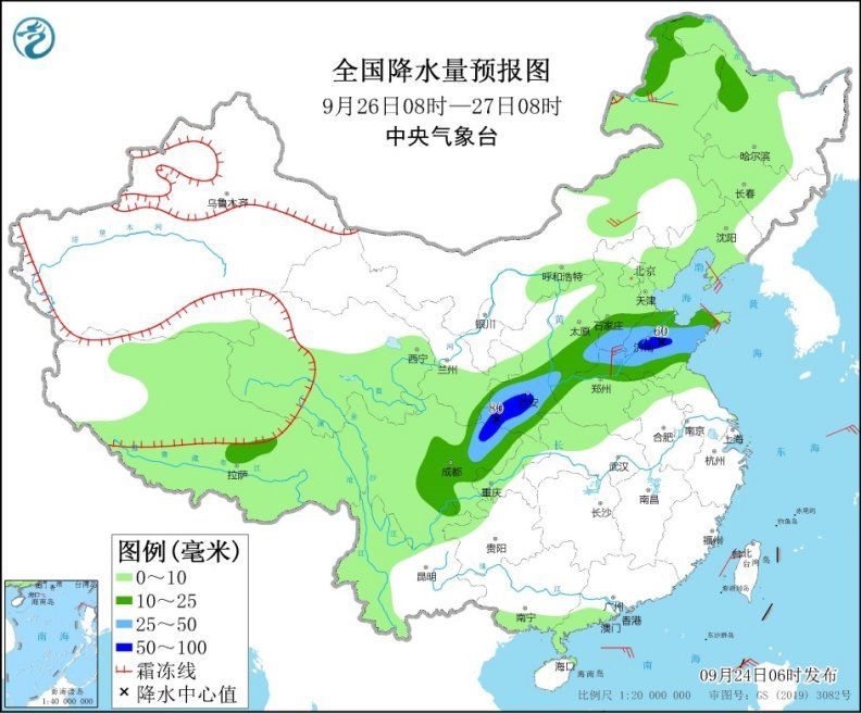 中新網(wǎng)9月24日電 據(jù)中央氣象臺(tái)網(wǎng)站消息,24日至26日,西北地區(qū)東南部、四川盆地中北部、華北中南部、黃淮等地有較強(qiáng)降水過(guò)程。甘肅東南部、陜西中南部、華北南部、山東中南部、河南北部等地部分地區(qū)有暴雨,局地大暴雨。