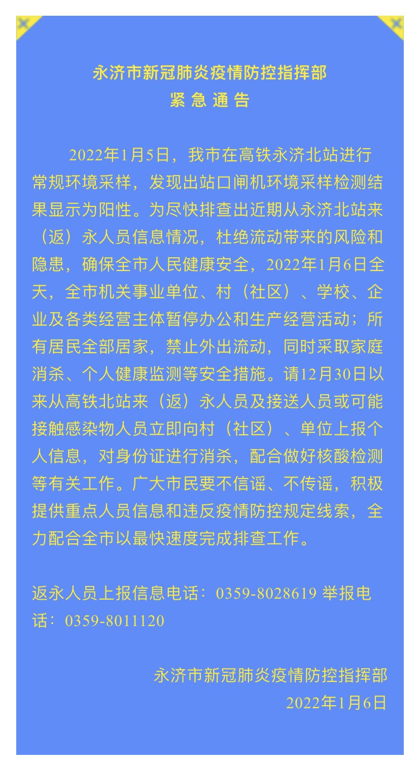 2022年1月5日,山西省永濟市在高鐵永濟北站進行常規(guī)環(huán)境采樣,發(fā)現(xiàn)出站口閘機環(huán)境采樣檢測結(jié)果顯示為陽性。為盡快排查出近期從永濟北站來(返)永人員信息情況,杜絕流動帶來的風險和隱患,確保全市人民健康安全,1月6日全天,全市機關(guān)事業(yè)單位、村(社區(qū))、學校、企業(yè)及各類經(jīng)營主體暫停辦公和生產(chǎn)經(jīng)營活動;所有居民全部居家,禁止外出流動,同時采取家庭消殺、個人健康監(jiān)測等安全措施。請12月30日以來從高鐵北站來(返)永人員及接送人員或可能接觸感染物人員立即向村(社區(qū))、單位上報個人信息,對身份證進行消殺,配合做好核酸檢測等有關(guān)工作。廣大市民要不信謠、不傳謠,積極提供重點人員信息和違反疫情防控規(guī)定線索,全力配合全市以最快速度完成排查工作。