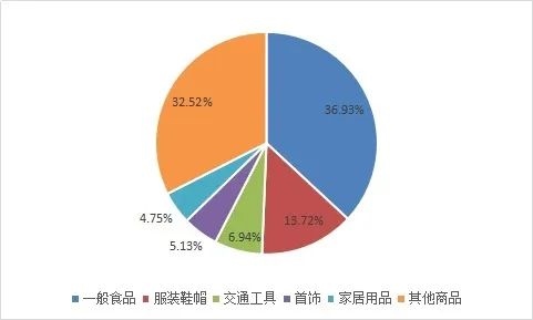 投訴量排在前五位的商品大類依次為一般食品類、服裝鞋帽類、交通工具類、首飾類、家居用品類。