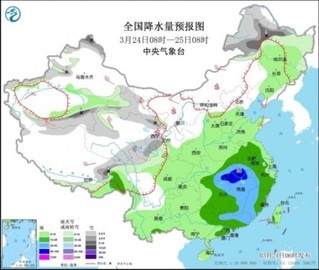 圖2 全國(guó)降水量預(yù)報(bào)圖(3月24日08時(shí)-25日08時(shí))
