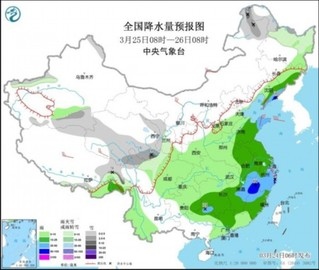 圖3 全國(guó)降水量預(yù)報(bào)圖(3月25日08時(shí)-26日08時(shí))