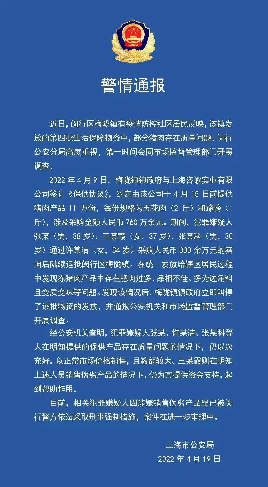 警方通報:2022年4月9日,梅隴鎮(zhèn)鎮(zhèn)政府與上海咨諭實業(yè)有限公司簽訂《保供協(xié)議》,約定由該公司于4月15日前提供豬肉產(chǎn)品11萬份,每份規(guī)格為五花肉(2斤)和蹄髈(1斤),涉及采購金額人民幣760萬余元。其間,犯罪嫌疑人張某(男,38歲)、王某霞(女,37歲)、張某科(男,30歲)通過許某潔(女,34歲)采購人民幣300余萬元的豬肉后陸續(xù)運抵閔行區(qū)梅隴鎮(zhèn)。在統(tǒng)一發(fā)放給轄區(qū)居民過程中發(fā)現(xiàn)凍豬肉產(chǎn)品中存在肥肉過多、品相不佳、多為邊角料且變質(zhì)變味等問題。發(fā)現(xiàn)該情況后,梅隴鎮(zhèn)鎮(zhèn)政府立即叫停了該批物資的發(fā)放,并通報公安機關(guān)和市場監(jiān)督管理部門開展調(diào)查。