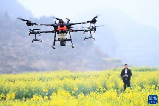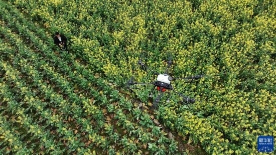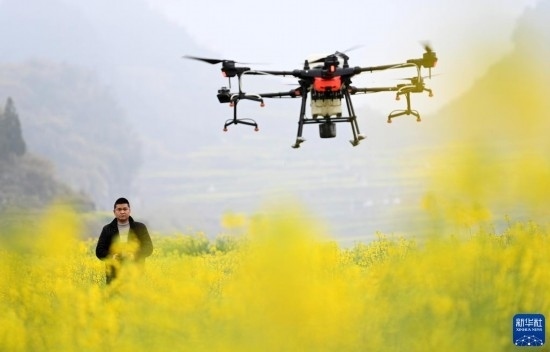 2月17日,在貴州省六盤水市六枝特區(qū)木崗鎮(zhèn)油菜基地,農(nóng)技人員利用植保無人機(jī)進(jìn)行春管。