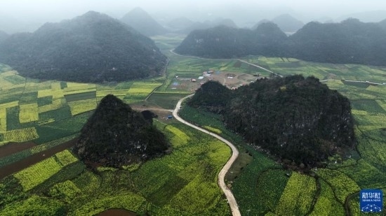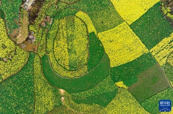 2月17日拍攝的貴州省六盤水市六枝特區(qū)木崗鎮(zhèn)萬畝油菜基地(無人機(jī)照片)。