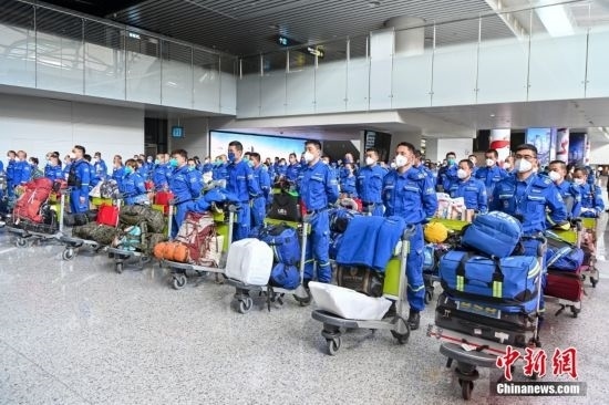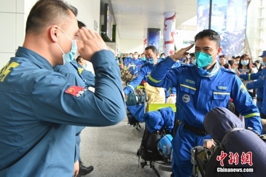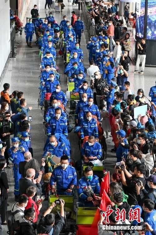 2月19日,廣東省廣州市,藍(lán)天救援隊(duì)赴土耳其隊(duì)員抵達(dá)廣州白云機(jī)場(chǎng)。當(dāng)日,100余名藍(lán)天救援隊(duì)赴土耳其隊(duì)員搭乘CZ8066航班返抵廣州。中新社記者 陳驥旻 攝