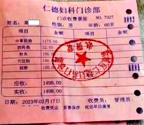 高先生被說動了,在王女士的陪同下來到了這名男子口中的“仁德醫(yī)院”。進(jìn)去以后,發(fā)現(xiàn)醫(yī)院的名字叫“仁德婦科門診”。醫(yī)生確實(shí)如男子所說的那樣,告訴高先生不用做手術(shù),給開了1498元的中藥和中醫(yī)治療項(xiàng)目(如圖)。