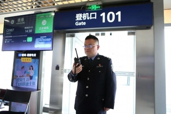 圖為亢杰在登機口匯報出境航班登機情況。