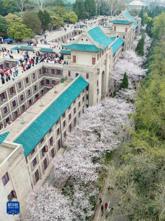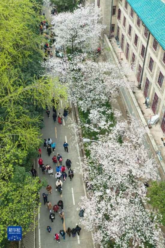 3月18日,來自各地的抗疫醫(yī)護(hù)人員及家屬在武漢大學(xué)校園賞櫻(無人機照片)。